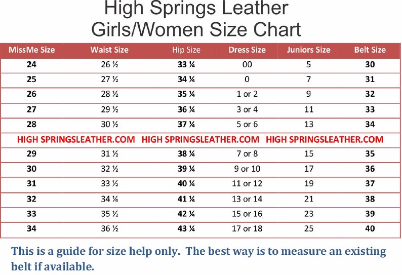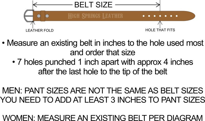 • Sizes of pants vary wildly; this is why we use inches to measure belts. If you do not have access to an existing belt, MEN typically add at least 3 inches to their pant size. For WOMEN, if measuring is not an option please refer to the recommended sizing chart; your jean size is NOT the correct belt size to order
